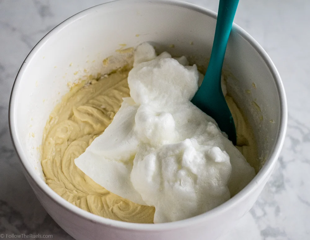 - In a separate, clean bowl whip the egg whites until soft peaks form. About 2 minutes. Fold the egg whites into the rest of the batter, being careful not to deflate the egg whites.