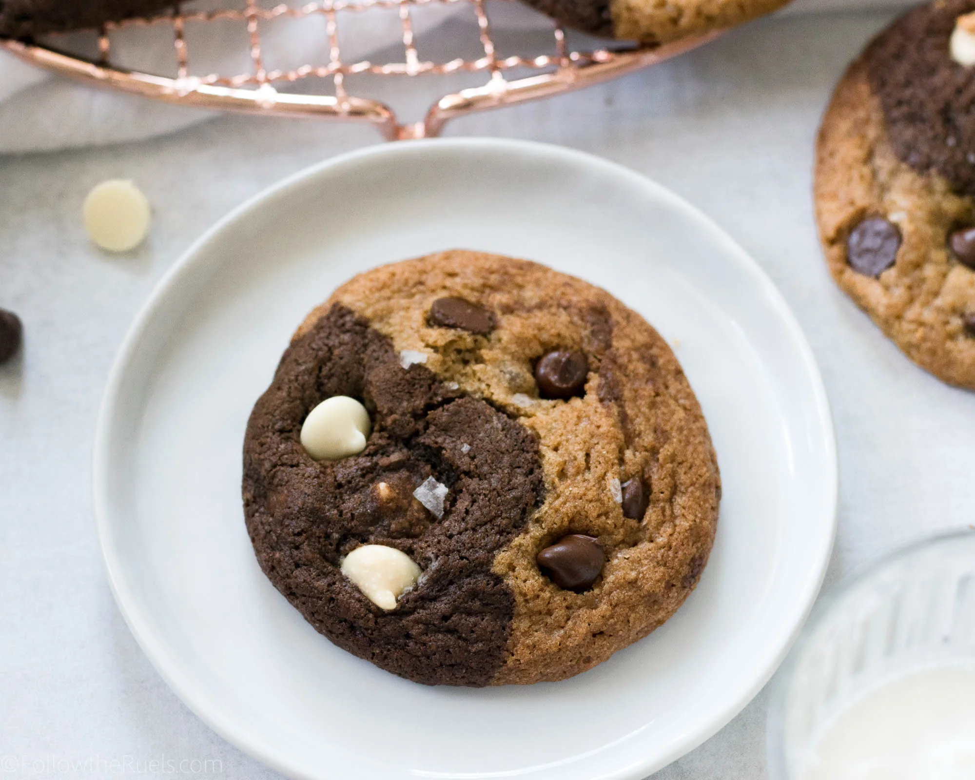 Can't decide between a classic chocolate chip cookie, and a reverse chocolate chip cookie (chocolate cookie with white chocolate chips)? Well, you don't have to! Instead, make these ying-yang-esque cookies which combine them both to make a black and white double chocolate chip cookie.