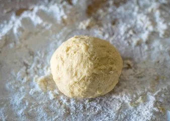 - Once the dough has formed a loose, shaggy ball, start to knead the dough together until it forms a tight ball that is slightly tacky, about 5 minutes. You may not end up using all the flour. Just add enough flour to form a ball. Wrap the dough in plastic wrap and refrigerate for at least 30 minutes.